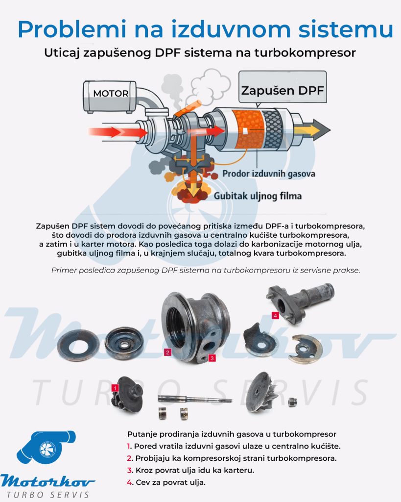 Zapušen DPF sistem dovodi do povećanog protivpritiska u izduvnom sistemu, odnosno do porasta pritiska između DPF-a i turbokompresora. U takvim uslovima izduvni gasovi više ne mogu nesmetano da se odvode, već se vraćaju ka turbini, što dovodi do prodora izduvnih gasova u centralno kućište turbokompresora, a zatim i u karter motora.