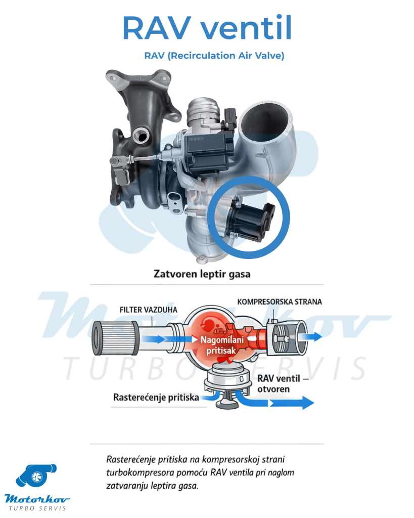 RAV ventil (Recirculation Air Valve) ima ključnu ulogu u zaštiti turbokompresora prilikom naglog zatvaranja leptira gasa, naročito kod benzinskih motora. U tim situacijama dolazi do naglog porasta pritiska na kompresorskoj strani, jer turbokompresor nastavlja da sabija vazduh iako je protok ka motoru prekinut.