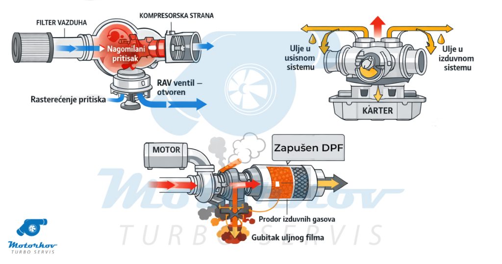 POSLEDICA: Pojava „Check Engine“ upozorenja, poremećaj rada sistema i česta totalna havarija turbokompresora.
